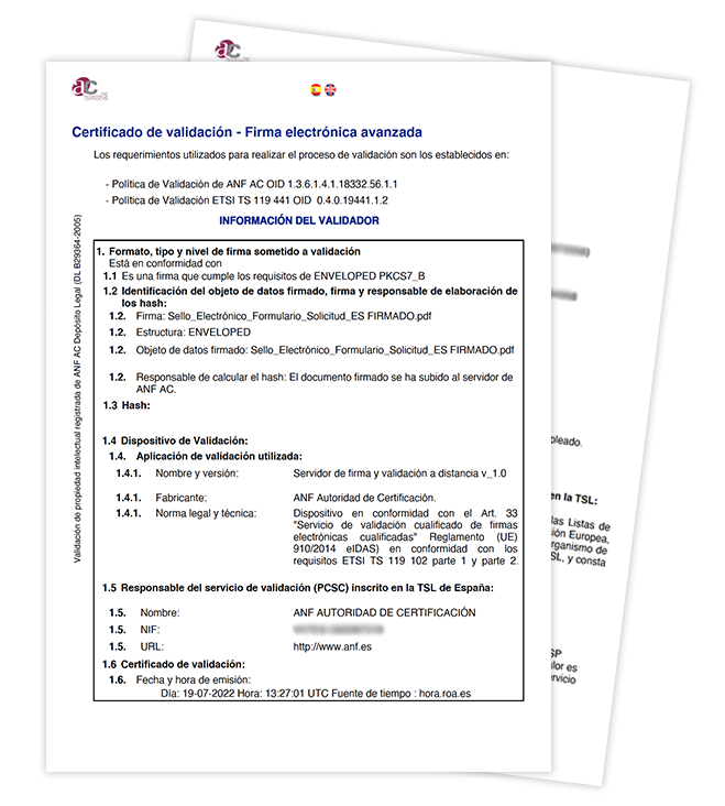 La realización de las validaciones se genera en una interfaz de fácil uso, que ofrece respuesta de forma automática en tan solo unos segundos. La respuesta de la plataforma, genera un Informe de Validación que servirá de garantía de validación, asumiendo ANF AC la responsabilidad del resultado generado.